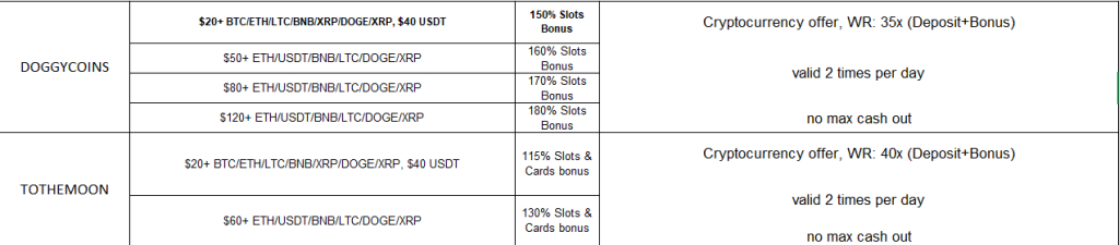 | DOGCRYPTONIZED | 230% Slots & Cards Bonus | 5 times | Min. deposit: $20 BTC, $20 ETH, $20 LTC, $20 BNB, $20 XRP, $20 DOGE, $30 CC, $40 USDT. WR: 40x (Deposit+Bonus) |